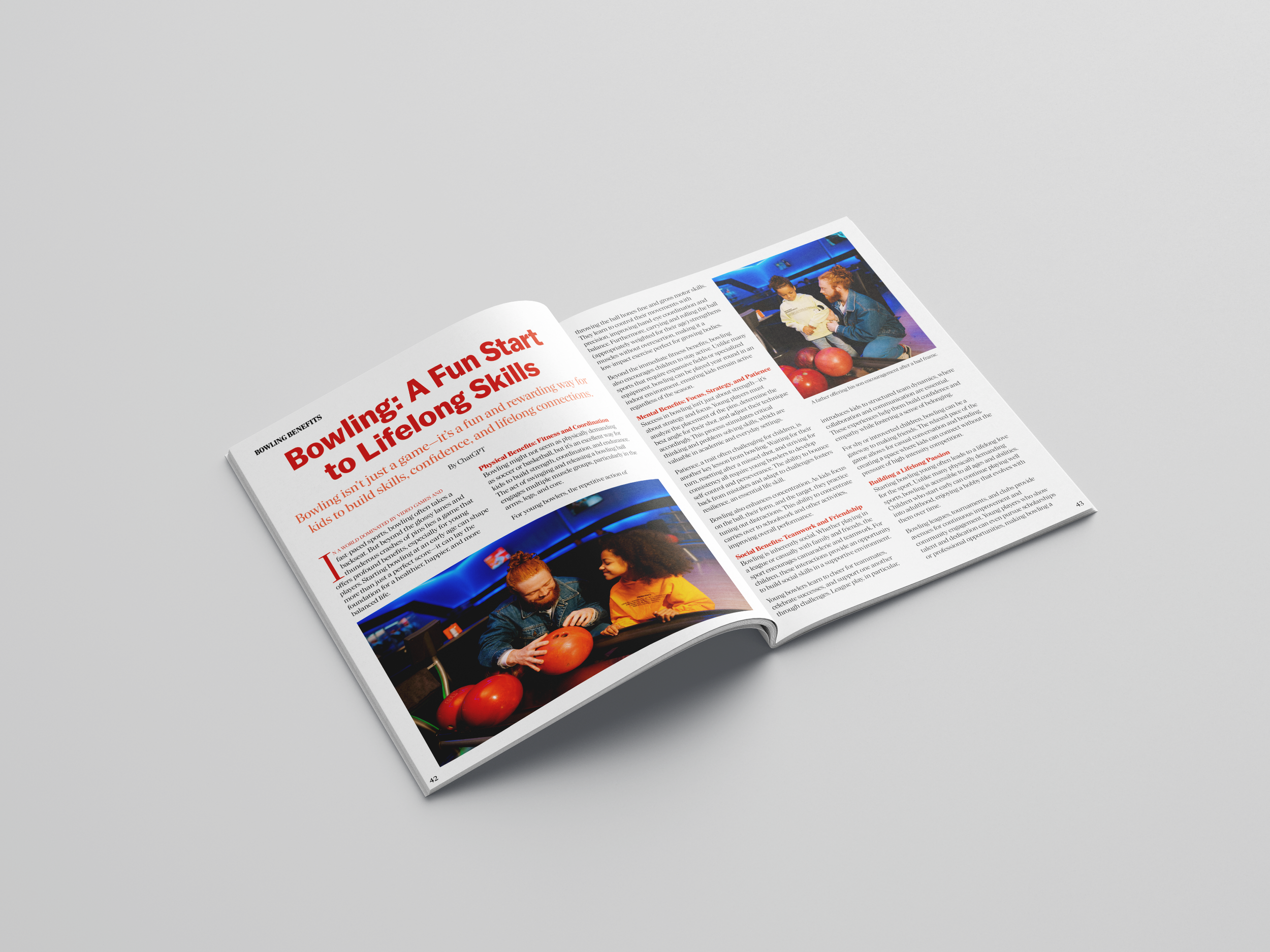 The goal for this design was to create a clean and organized layout for a bowling magazine. This allows the article featured in the magazine to be readable while also allowing for a visually interesting design that matches the images and content of the article.