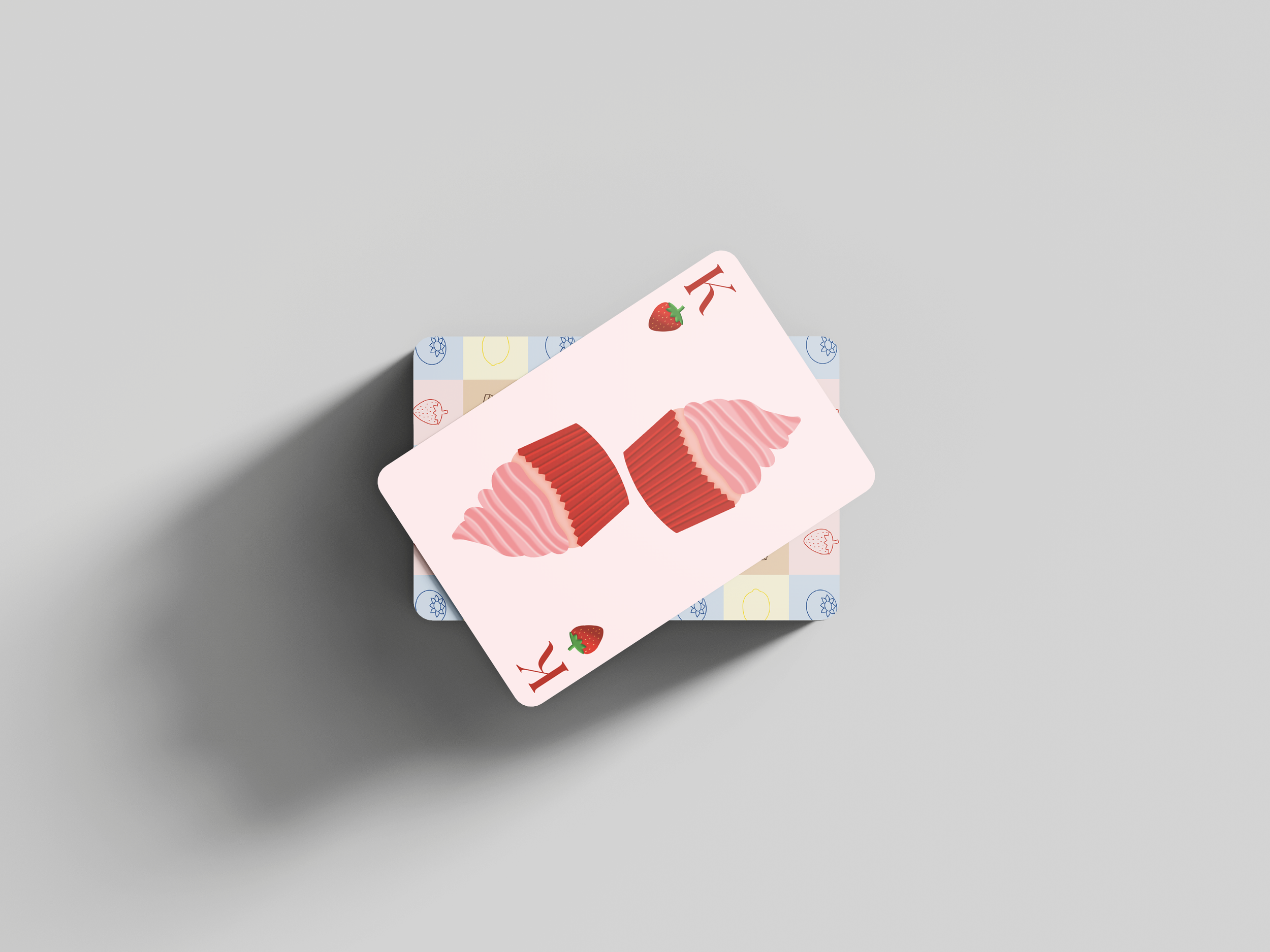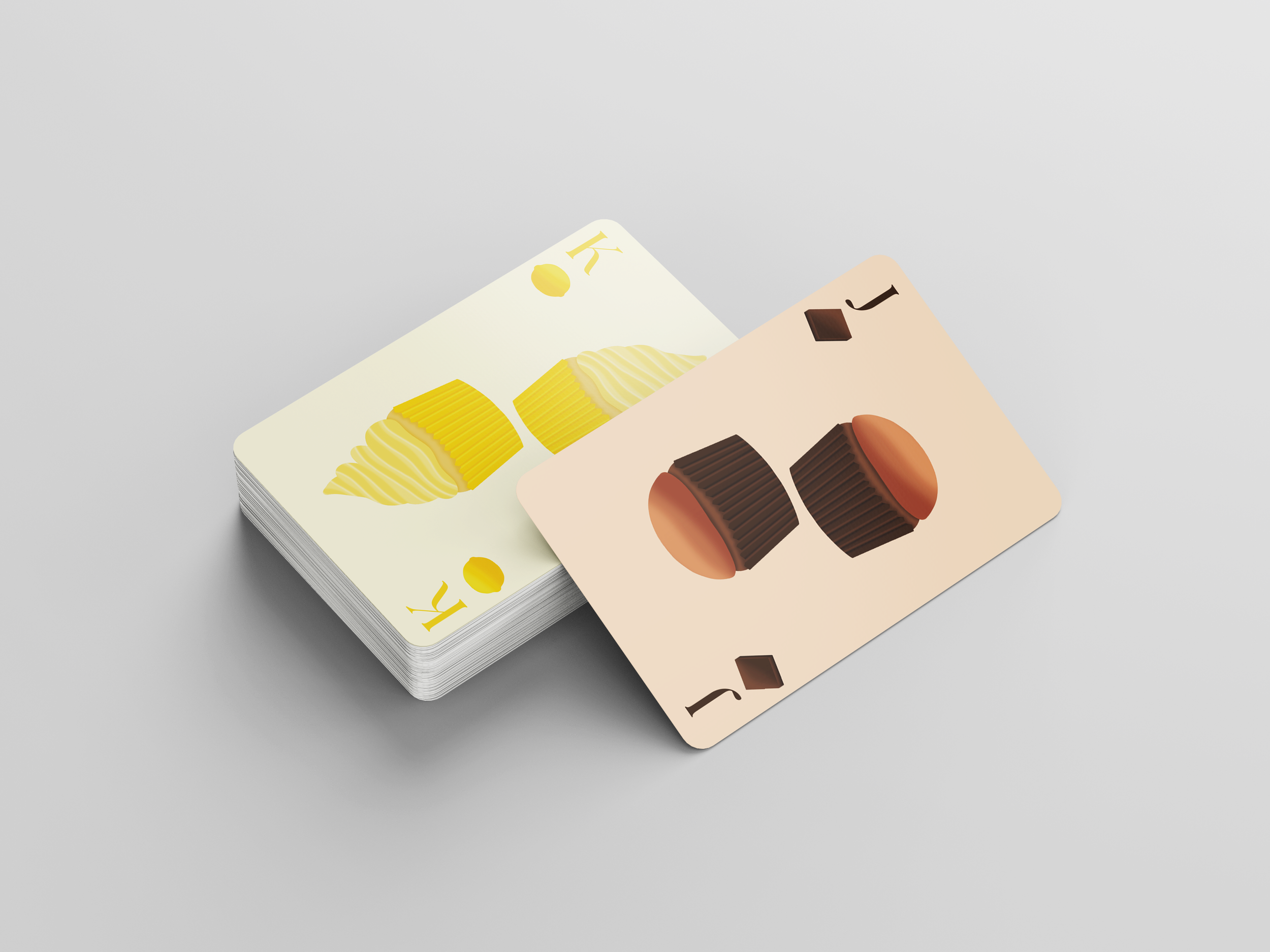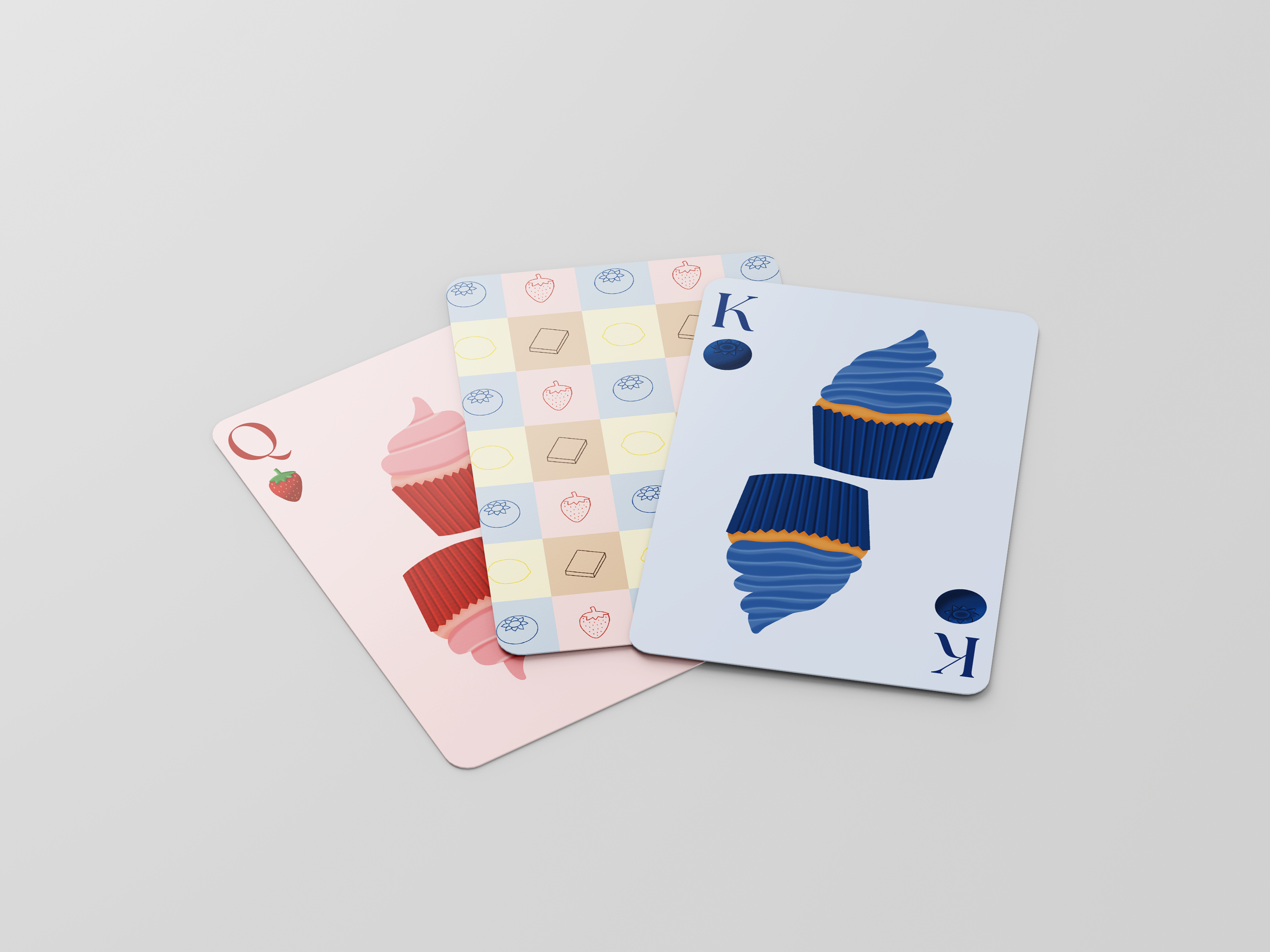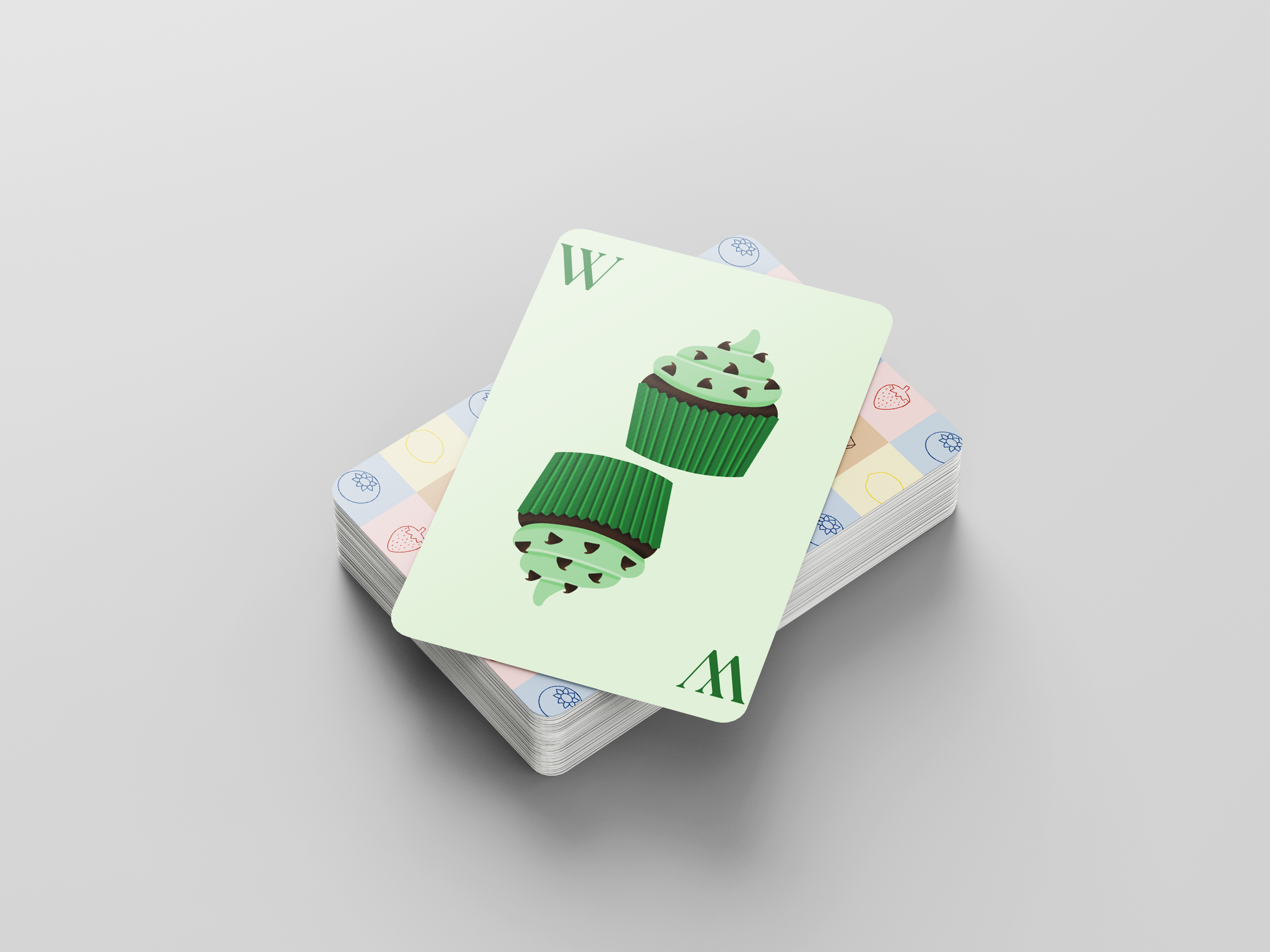 Icing on the Cake Playing Cards is a playing card set designed with a cupcake theme. The four suits are different cupcake flavors. The suits include blueberry, strawberry, lemon, and chocolate. To make the wild card different from the suits, it features a mint chocolate cupcake. The back of the card was designed to represent all of the suits, and the packaging uses colors from the playing cards.